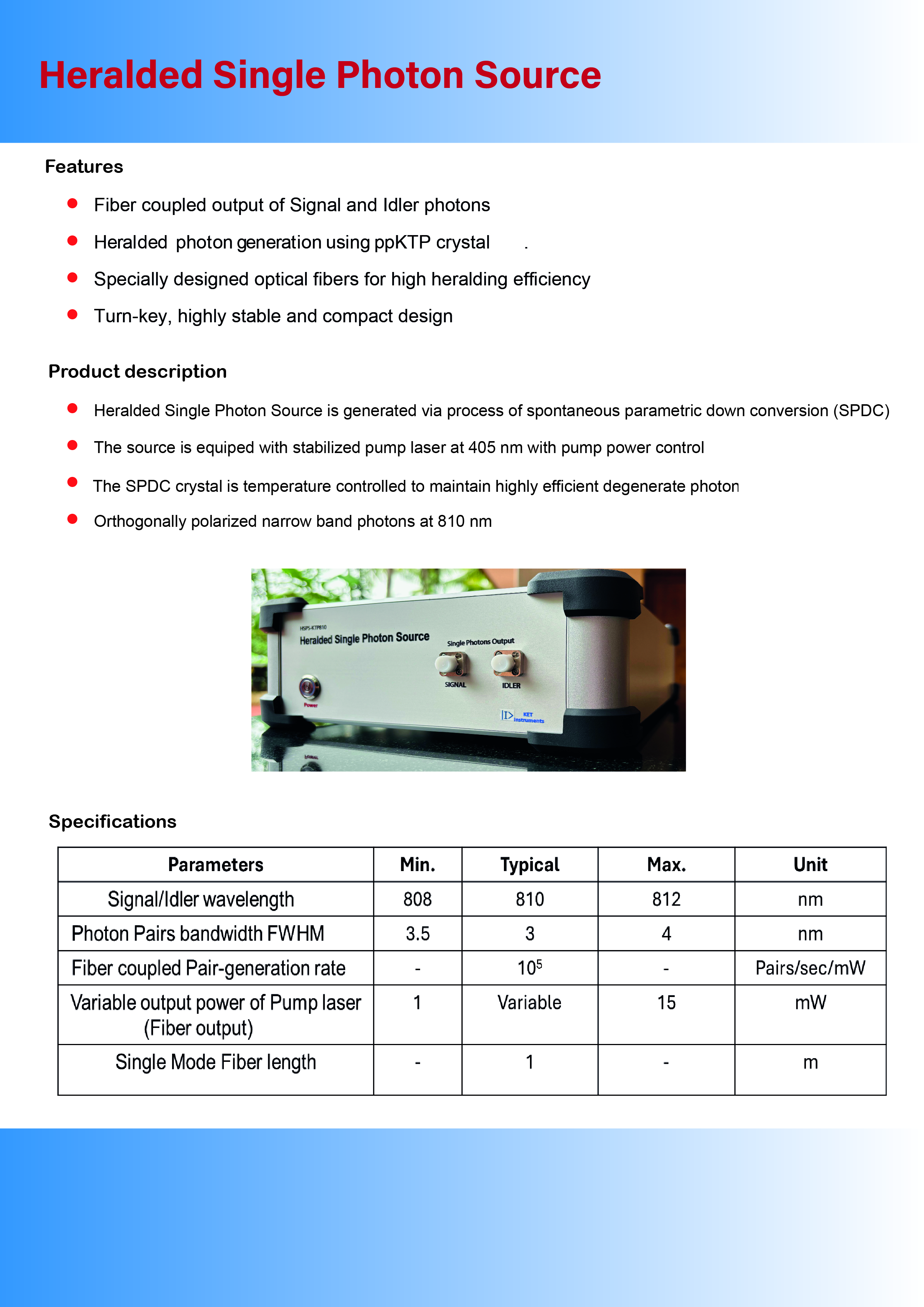 • Fiber coupled output of Signal and Idler photons